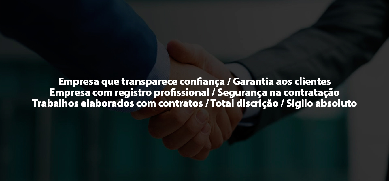 Todos os nossos trabalhos são elaborados com contratos, expecificando os detalhes do trabalho que será realizado, com todos os termos e cláusulas para assim o cliente ficar ciente do trabalho que será executado no seu caso, dando todas as garantias do trabalho que será prestado e assim estando de acordo o cliente deverá assinar o contrato no que foi acordado.
