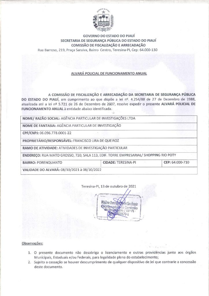 A agência do detetive Queiroz é a única do Piauí com Alvará de Funcionamento expedido pela Policia do Estado.