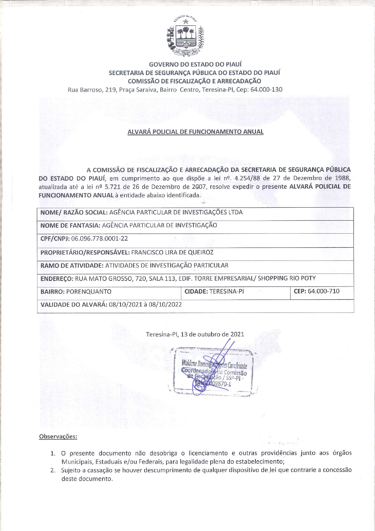 Agência com Alvará de funcionamento concedido pela Secretaria de Segurança Pública do Estado do Piauí